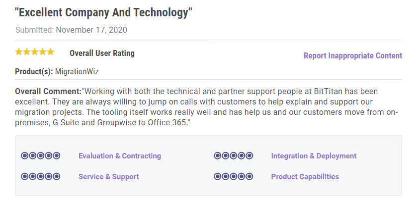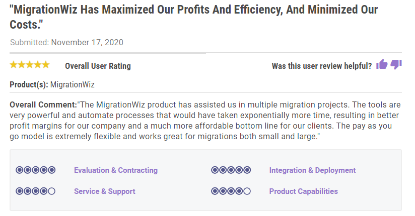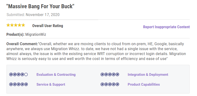 Case studies hold some of these answers – as does /r/Office365 and /r/msp – but there’s another place with an extensive library of reviews on MigrationWiz: Gartner Peer Insights.